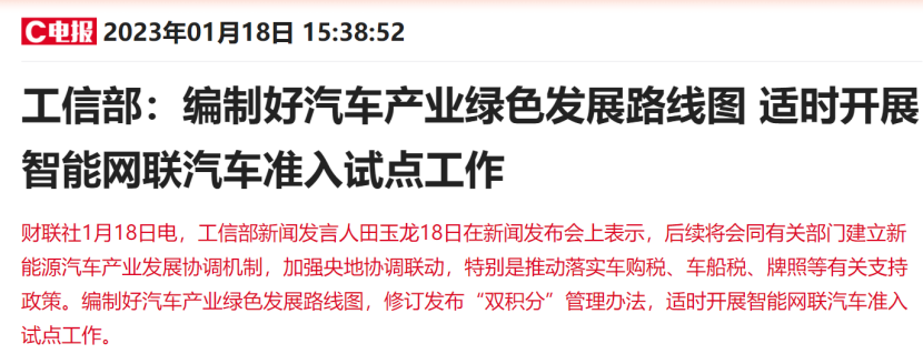 财联社1月22日讯(编辑 旭日)工信部新闻发言人田玉龙18日在新闻发布会上表示,编制好汽车产业绿色发展路线图,修订发布“双积分”管理办法,适时开展智能网联汽车准入试点工作。