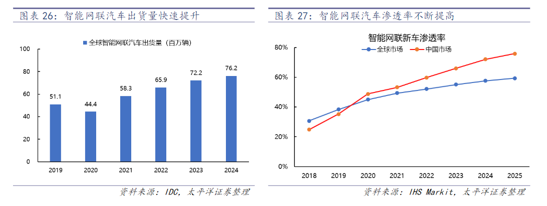 据IDC统计,2020年全球智能网联汽车出货量约为4440万辆,较2019年下滑10.6%,主要系疫情冲击所致,预计2020至2024年的年均复合增长率(CAGR)为14.5%。每年新车出货量中智能网联汽车渗透率逐步提升,据IHS Markit统计,预计到2025年全球市场智能网联汽车渗透率达到60%,中国市场将超过75%。