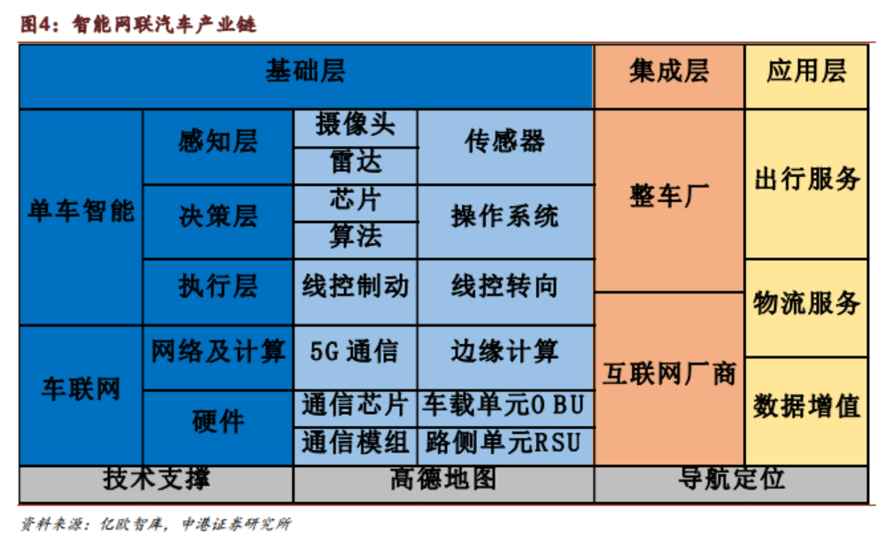 从产业链看,智能网联汽车主要包括整车厂商(传统汽车厂商、新造车厂商)、传感器厂商、芯片厂商、电子通讯供应商、平台运营商、内容服务商及底层支撑服务商等多种角色。