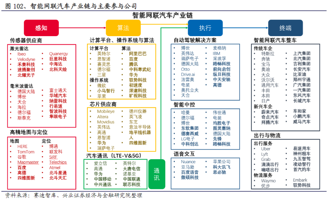 执行层(自动驾驶解决方案、智慧中控和语音交互)涉及上市公司包括路畅科技(002813)、东软集团(600718)、德赛西威(002920)、均胜电子(600699)、科大讯飞(002230)、中科创达(300496)、经纬恒润等。终端包括上汽集团(600104)、长安汽车(000625)、广汽集团(601238)、比亚迪(002594)、东风汽车(600006)、长城汽车(601633)等。