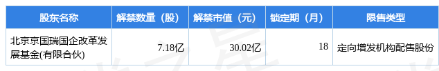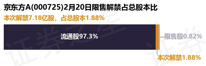 根据市场公开信息整理,京东方A(000725)于2月20日将有7.18亿股限售股份解禁上市,为公司定向增发机构配售股份,占公司总股本1.88%。最近一年内,该股累计解禁29.32亿股,占总股本的7.68%。本次解禁后,公司还有3.15亿股限售股份,占总股本0.82%。具体如下图所示: