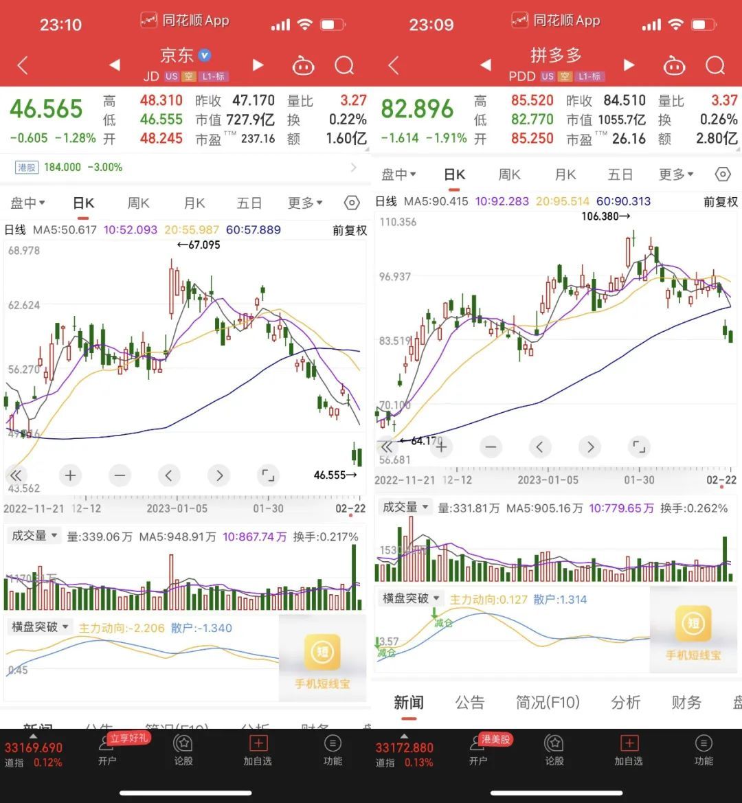 这会美股开盘,京东和拼多多的股东还没收复失地。。。百亿补贴的钱,股民先出了。